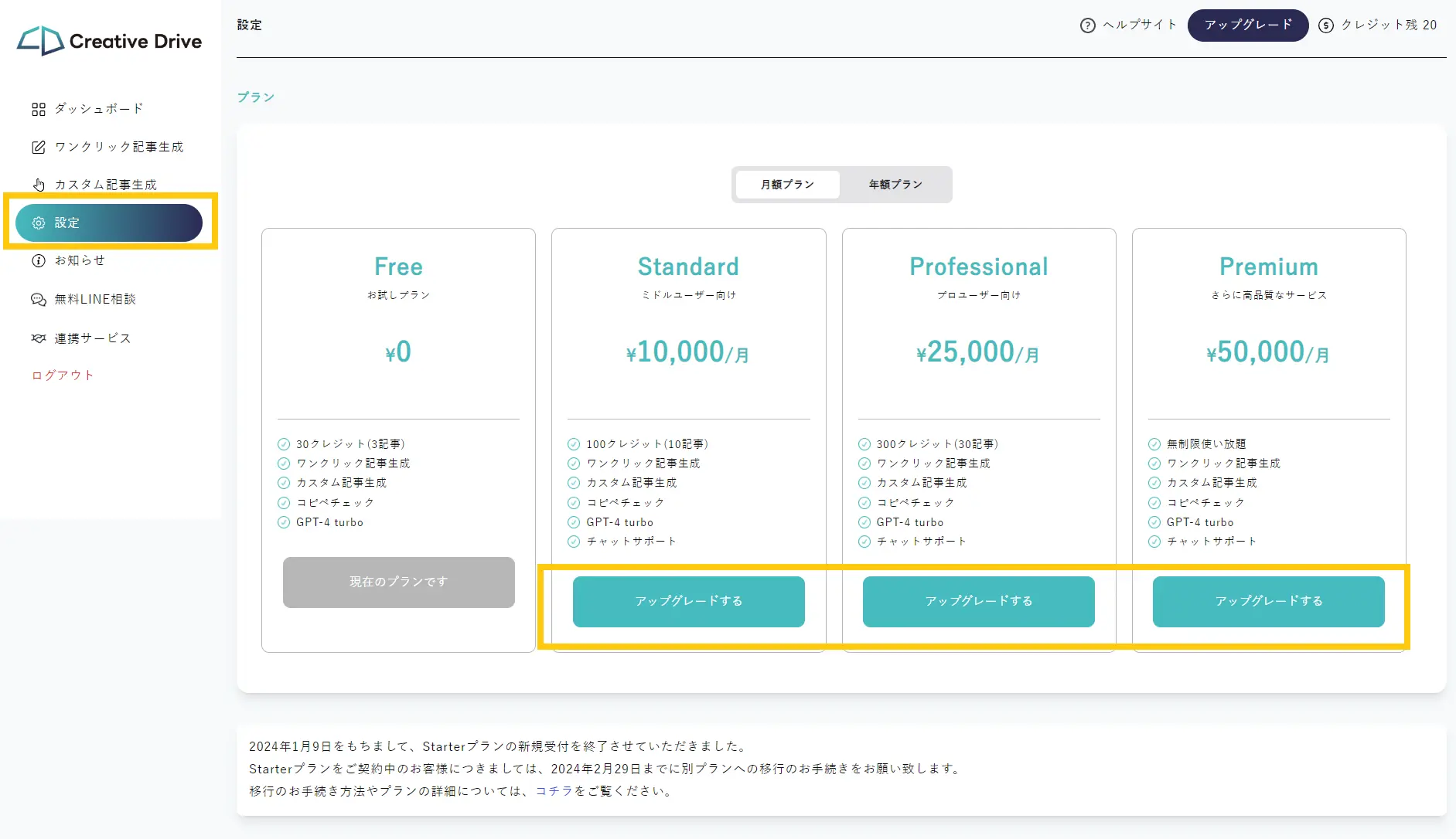 左欄の「設定」をクリックすると上記のような料金表が表示されます。各プランの「アップグレードする」をクリックすると、それぞれ任意のプランの決済画面に移行します。