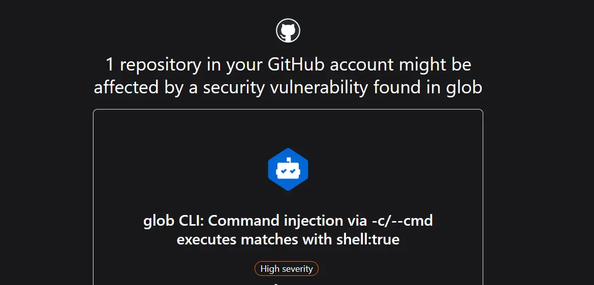 GitHubが、リポジトリ内で使用されている npm パッケージ「glob」に既知のセキュリティ脆弱性が含まれている可能性を検知し、通知してくれる警告メールです。今回の警告は、glob の CLI オプションによりコマンドインジェクションが発生する恐れがある点に関するものです。