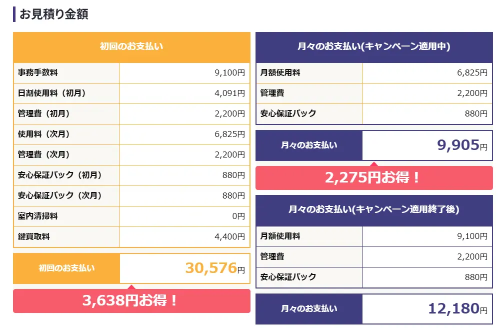 のケース(2026年4月13日時点)では、月額使用料が6,825円に加え、管理費2,200円と安心保証パック880円が加わり、合計で9,905円となっています。キャンペーン終了後は月額使用料が9,100円となり、合計12,180円まで上がります。