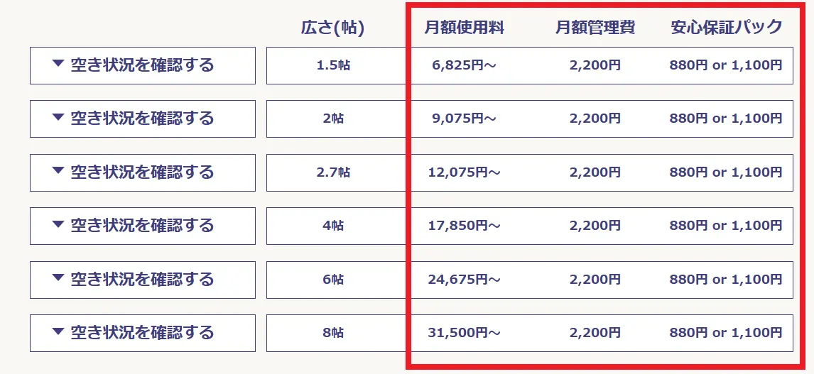 - サイズ(広さ):小さいほど安く、大きいほど高い