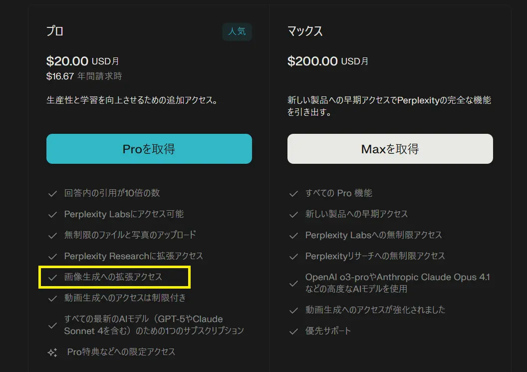 Perplexityで月間利用上限を超えて画像生成機能を使用するには、プロ版に加入しなければなりません。