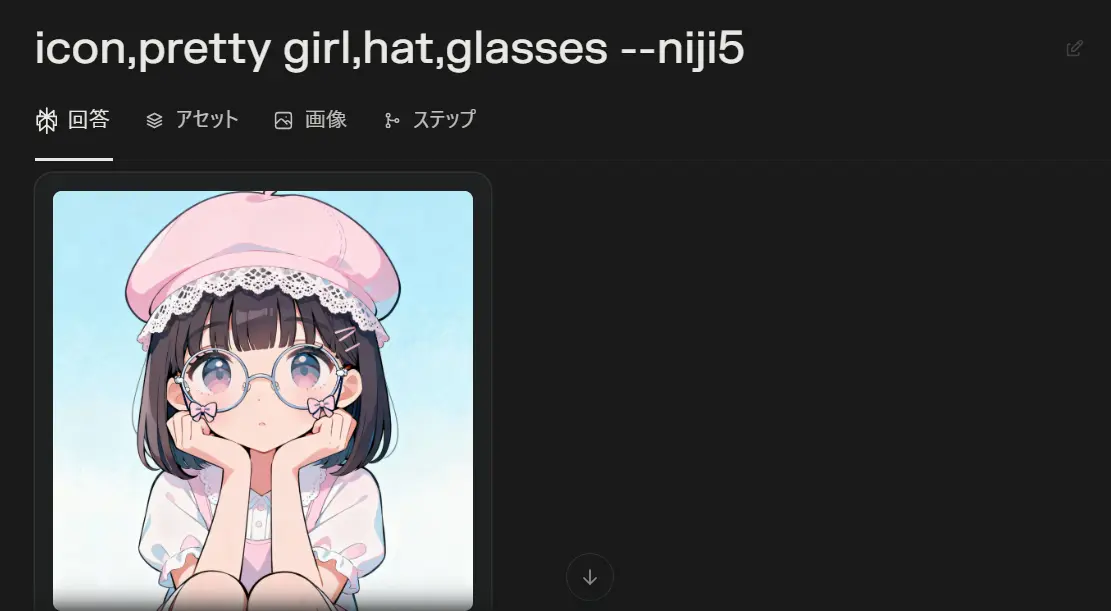 icon,pretty girl,hat,glasses --niji5上記のように英単語を打ち込んでください。下記のように「メガネをかけた美少女アニメ」が作成されました。