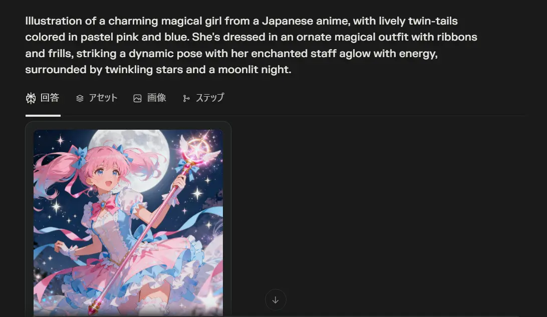 Illustration of a charming magical girl from a Japanese anime, with lively twin-tails colored in pastel pink and blue. She's dressed in an ornate magical outfit with ribbons and frills, striking a dynamic pose with her enchanted staff aglow with energy, surrounded by twinkling stars and a moonlit night.今度は長いプロンプトです。ここまで細かく書くと自分が意図した画像を作成できます。
