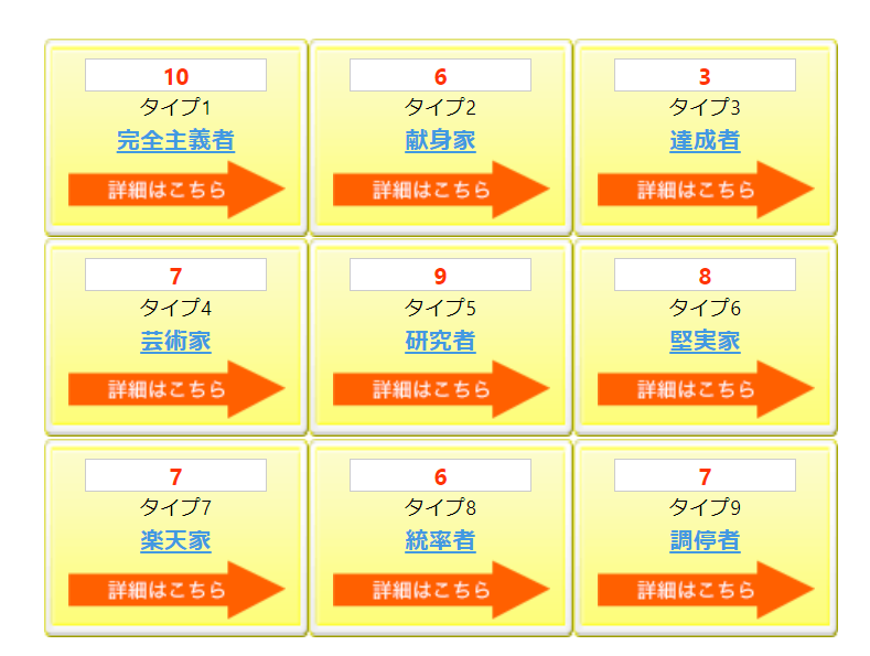 上記の画像で最も点数が高いタイプが、自分のタイプとされるそうです。最も高い点数は10で、「タイプ1: 完全主義者」が自分のタイプであることが分かりました。