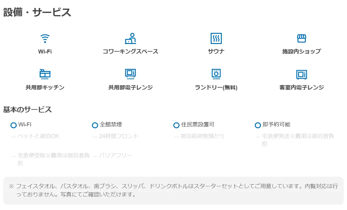 アメニティも、シャンプーやボディソープ、歯ブラシ、タオルなどは常に補充されているので、買い出しに行く手間が省けます。