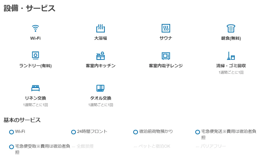 「アメニティも、シャンプーやボディソープ、歯ブラシ、タオルなどは常に補充されている」や「Wi-Fiはもちろん、キッチンには調理器具や食器類、洗濯機や乾燥機なども完備」などの特徴を書きましたが、これはホテルによって異なります。