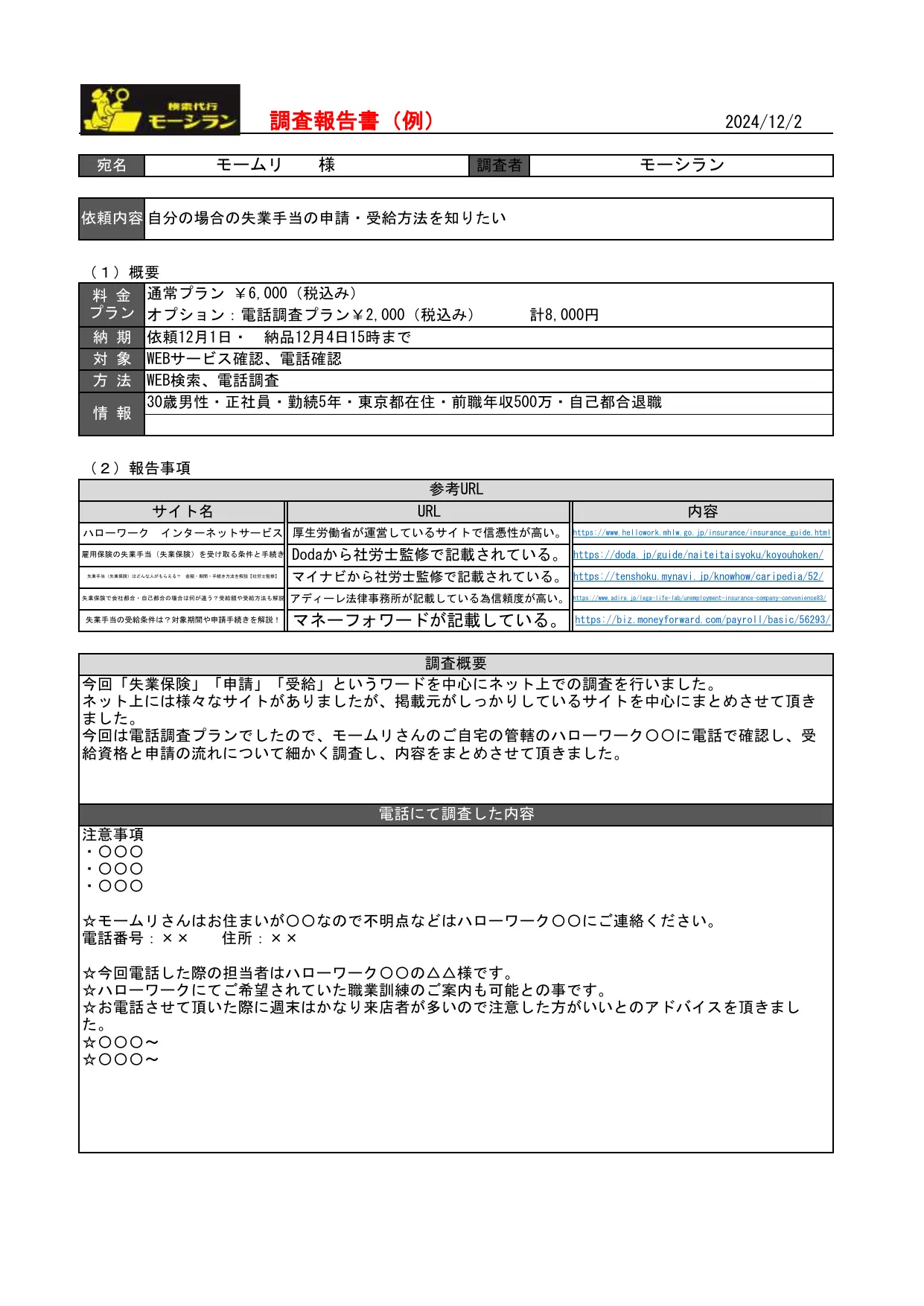 調査した内容は自動的に事例一覧に掲載されてしまいます。これを回避するには、「当社WEBページ・SNSへの検索代行実績の非掲載オプション(円 税込) 」を利用しましょう。 1,000