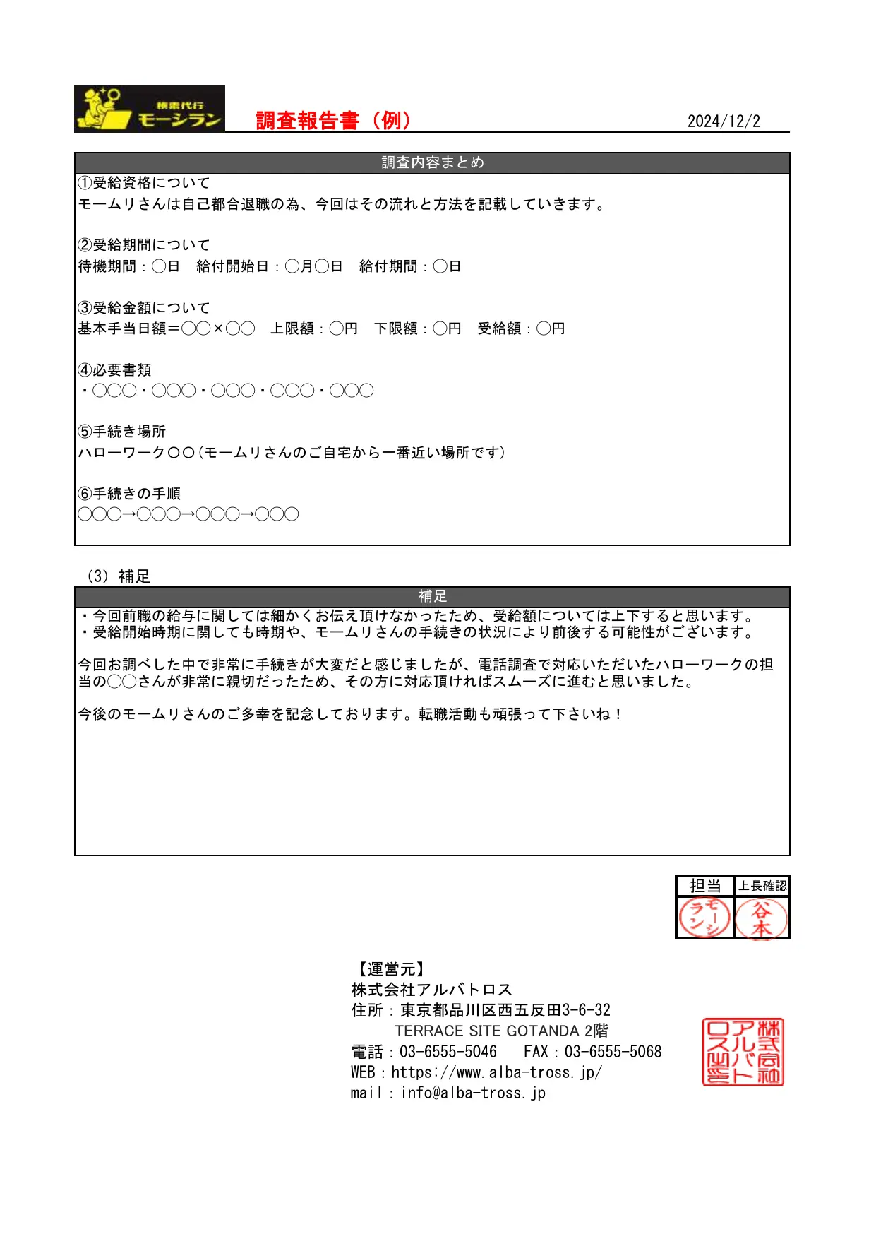 ネット検索に加えて電話調査も可能で、再就職や失業手当など退職後に役立つ情報を効率的に収集できるサービスです。